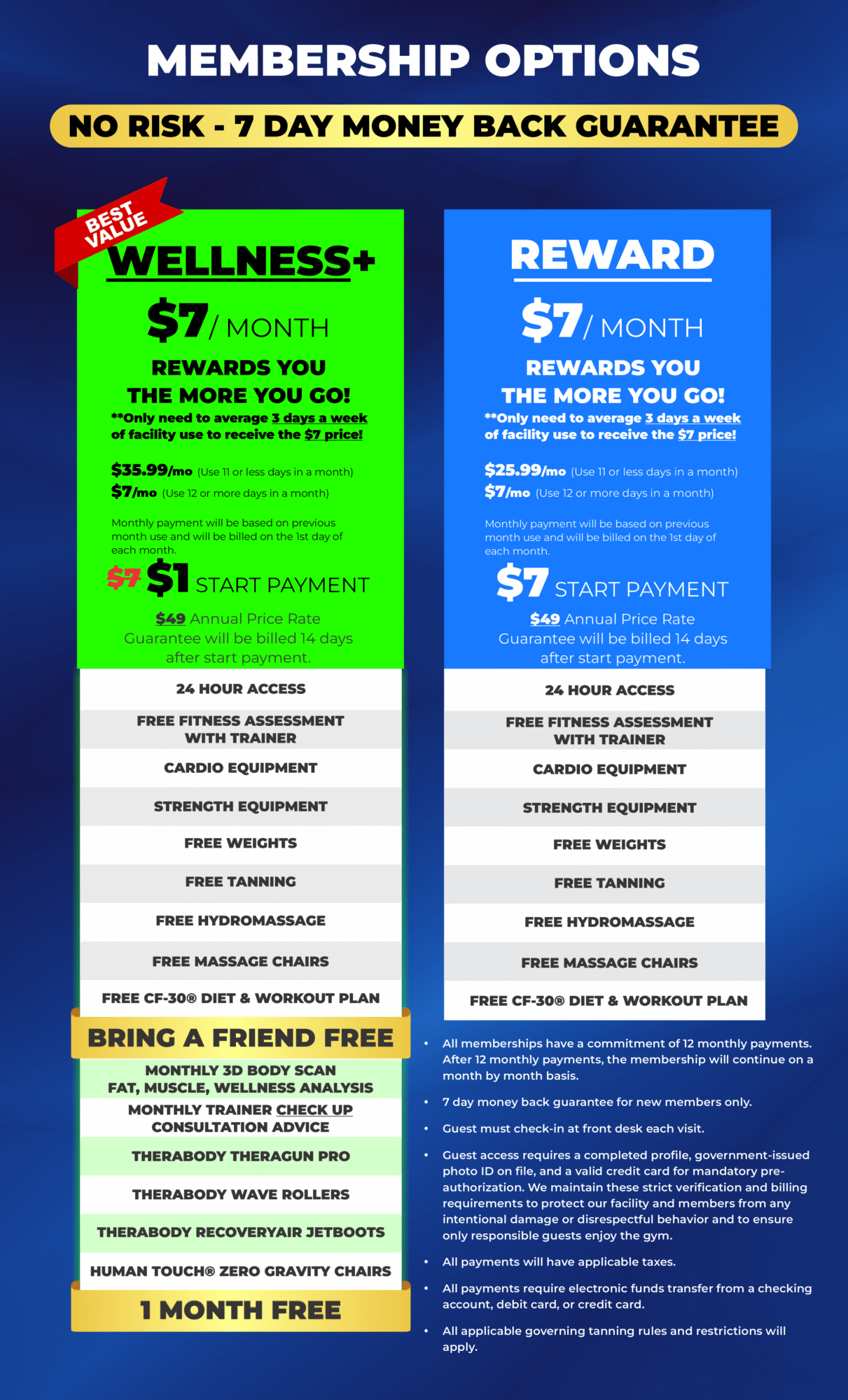 Join now for as low as $7 down and $7 a month to enjoy everything that we have to offer. Our memberships are backed with a 7-day money back guarantee. If during the first 7 days of your membership you realize we are not the right fit for you, we will give your money back after the membership is cancelled.
